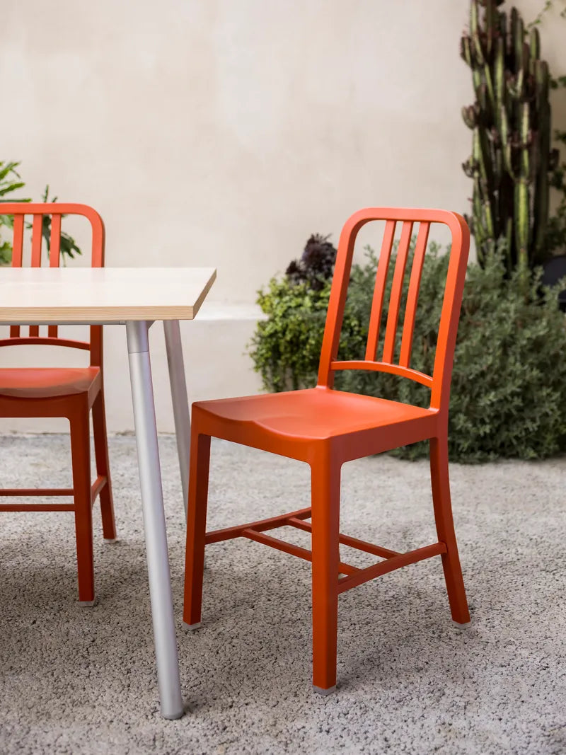 La 111 Navy Chair® est la toute première chaise fabriquée à partir de bouteilles en plastique recyclées. Chaque chaise est constituée d'au moins 170 bouteilles en plastique usagées. Fabriquée aux États-Unis et conçue pour résister à un usage intensif. Toutes les couleurs sont approuvées pour l'extérieur. Pour l'expédition rapide (Quick Ship), une quantité maximale de 30 pièces s'applique