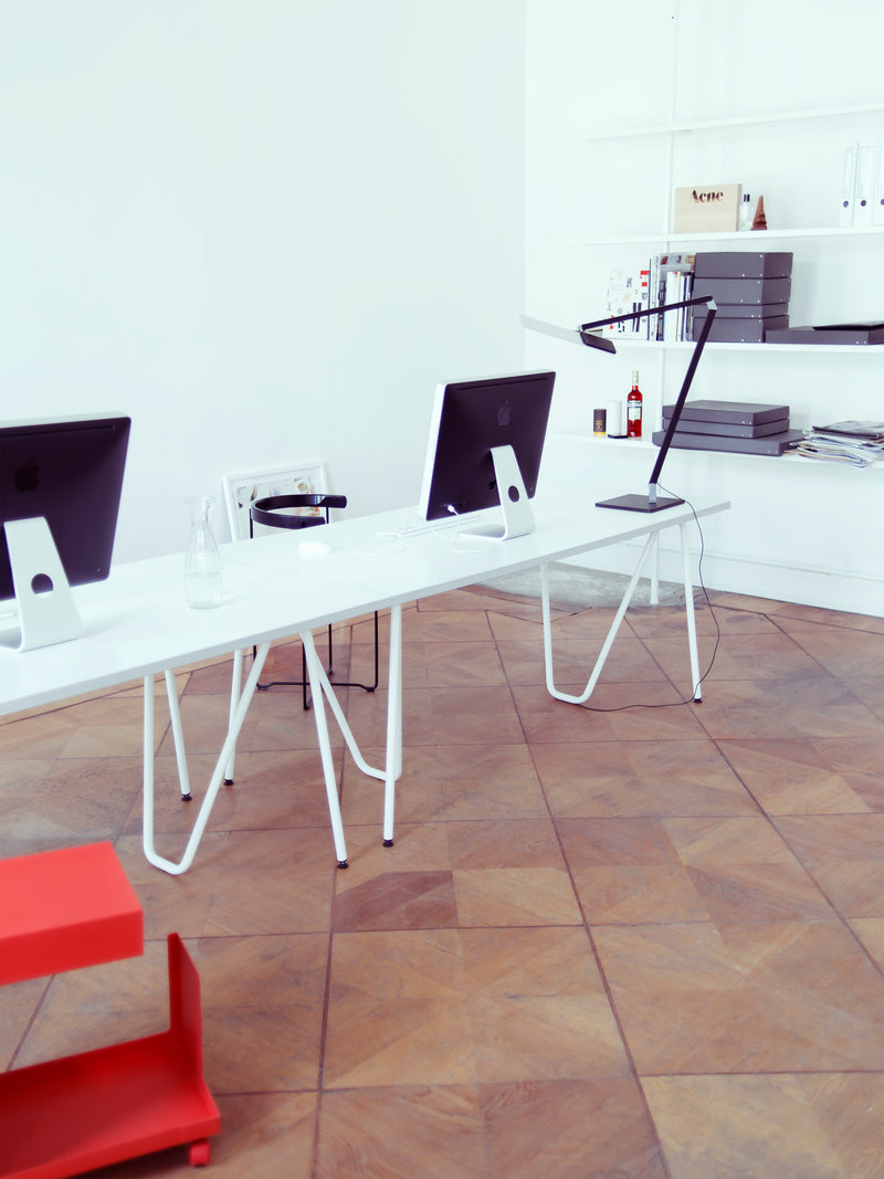 Grâce à ses différentes hauteurs et configurations, le piétement E2 peut être utilisé aussi bien comme bureau que comme table à manger.