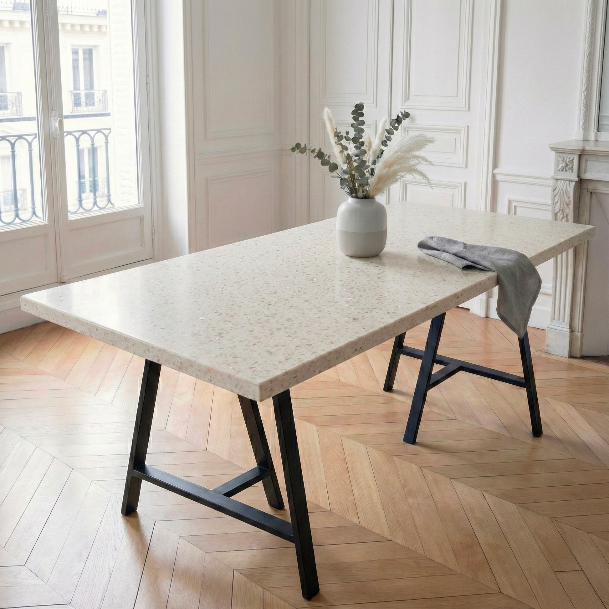 Saint-Jacques Naturel : Terrazzo ivoire lumineux parsemé de micro-fragments nacrés. Texture ultra-fine rappelant le terrazzo vénitien, sophistication discrète. Iridescence subtile capturant la lumière.