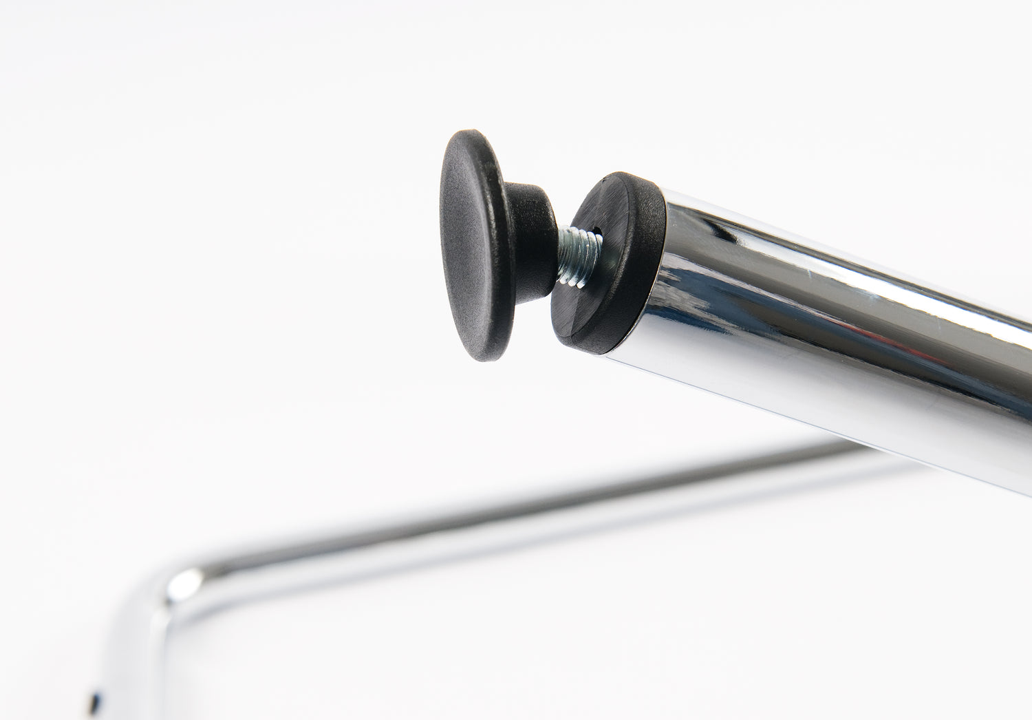 Pour les installations nécessitant une fixation permanente du plateau, un perçage est prévu sous les patins de support, permettant de solidariser durablement le plateau à la structure sans compromettre la finesse visuelle du piétement.
